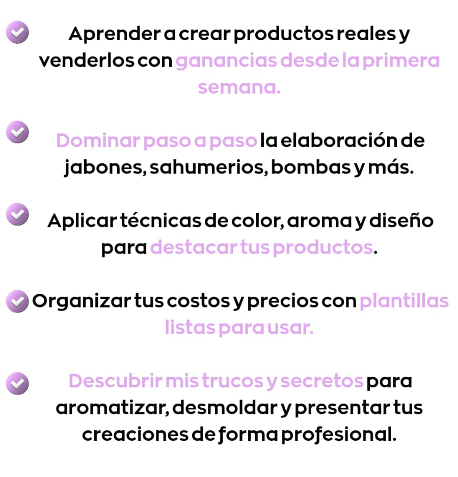 ¡Para nada! 🧼💜 Está pensado para principiantes. Te enseño desde cero cómo crear tus primeras piezas, con materiales fáciles de conseguir y explicaciones claras para que puedas lograr resultados hermosos aunque nunca hayas hecho un jabón antes.